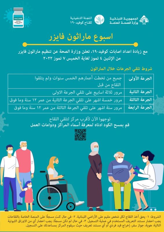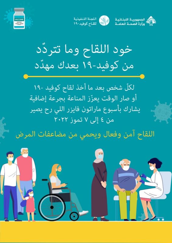 خود اللقاح وما تتردد...من كوفيد بعدك مهدّد. لكل شخص بعد ما أخذ لقاح كوفيد-19 او صار الوقت يعزز المناعة بجرعة اضافية يشارك بأسبوع ماراتون فايزر اللي رح يصير من ٤ الى ٧ تموز.