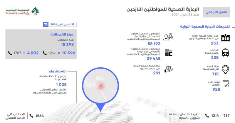 تنشر وزارة الصحة العامة التقرير التراكمي للدعم الذي تم تقديمه للمواطنين النازحين.