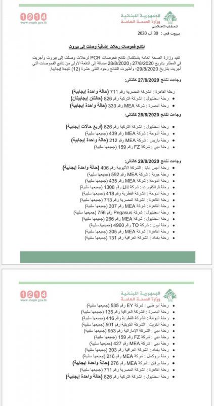 تفيد وزارة الصحة العامة باستكمال نتائج فحوصات PCR لرحلات وصلت إلى بيروت وأجريت في المطار بتاريخ 27/8/2020 و28/8/2020 إضافة الى  فحوصات أجريت بتاريخ 29/8/2020،  وأظهرت النتائج وجود اثنتي عشرة (12) حالة إيجابية.