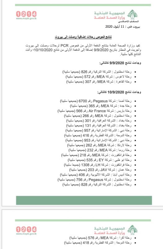 تفيد وزارة الصحة العامة بنتائج الدفعة الأولى من فحوص PCR لرحلات وصلت إلى بيروت وأجريت في المطار بتاريخ 9/9/2020, إضافة إلى الدفعة الأولى من نتائج 10/9/2020 وأتت النتائج كلها سلبية.