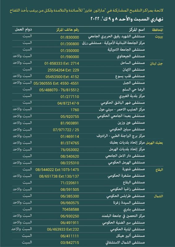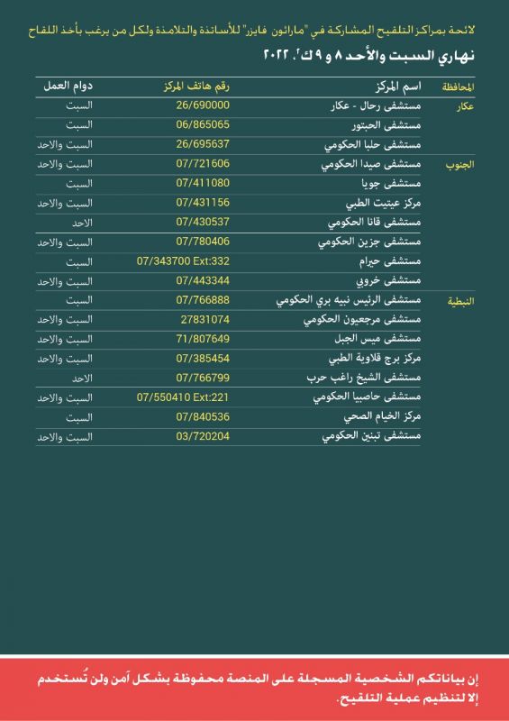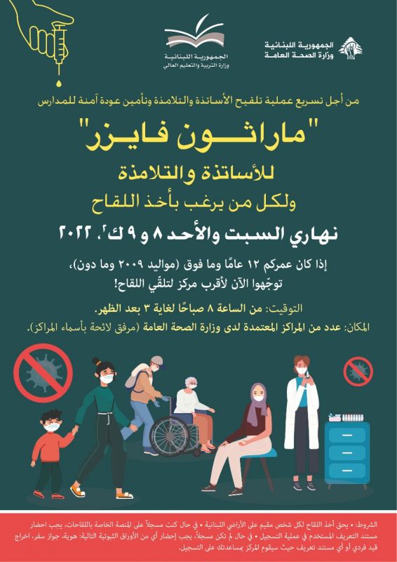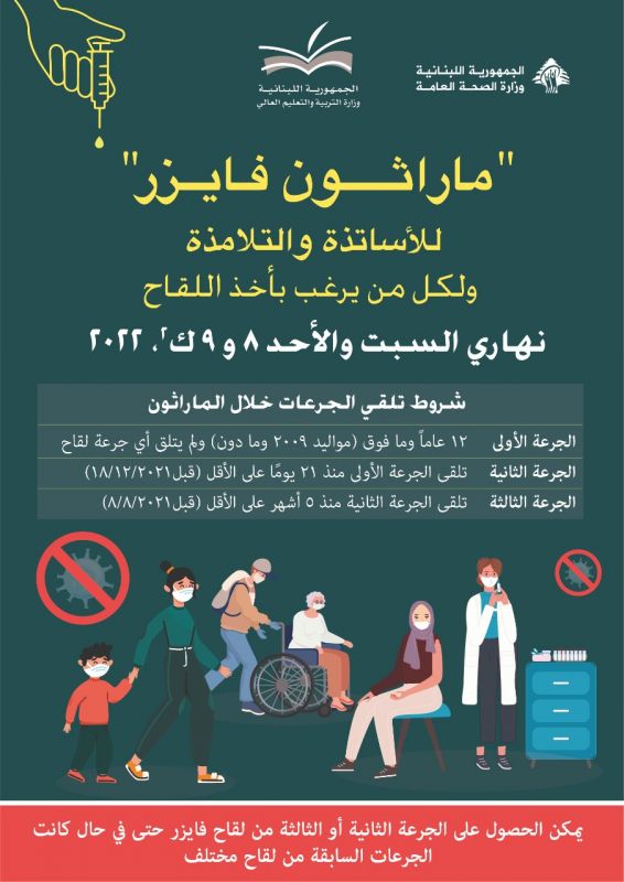 صدر عن وزارة الصحة العامة ووزارة التربية والتعليم العالي بيان مشترك أعلن عن تنظيم "ماراثون فايزر" لتلقيح التلامذة والقطاع التربوي وكل من يرغب بأخذ اللقاح (من عمر 21 سنة وما فوق أي مواليد 2009 وما دون) يومي السبت والاحد في الثامن والتاسع من كانون الثاني الجاري، من الثامنة صباحا حتى الساعة الثالثة بعد الظهر، وذلك لضمان سرعة تلقيح القطاع التربوي وتوفير عودة مدرسية آمنة.