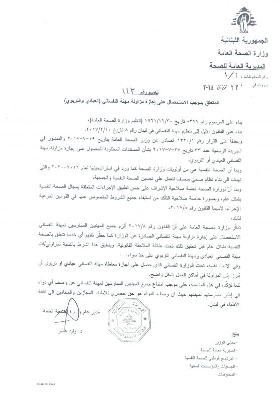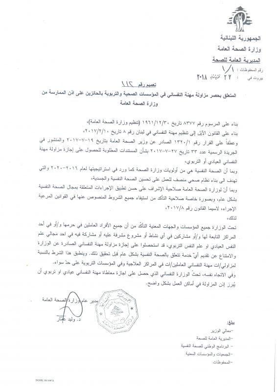| تعميم | المدير العام | 112 | 27-11-2018 | تعميم يتعلق بحصر مزاولة مهنة النفساني في المؤسسات الصحية و التربوية بالحائزين على اذن الممارسة من وزارة الصحة العامة | تعميم رقم 112: المتعلق بحصر مزاولة مهنة النفساني في المؤسسات الصحية و التربوية بالحائزين على اذن الممارسة من وزارة الصحة العامة |