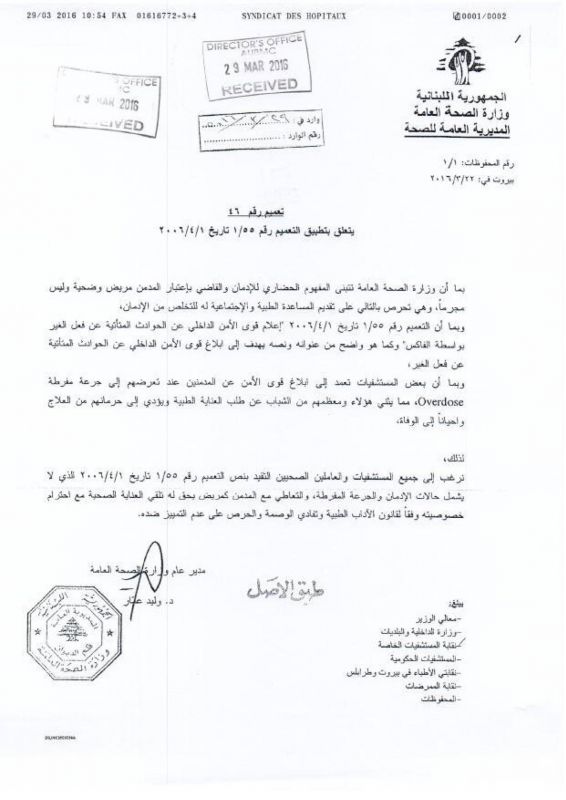 | تعميم | المدير العام | 46 | 22-03-2016 | طلب من المستشفايات عدم التبليغ عن حالات الادمان و الجرعة المفرطة | تعميم رقم 46: طلب من المستشفايات عدم التبليغ عن حالات الادمان و الجرعة المفرطة |
