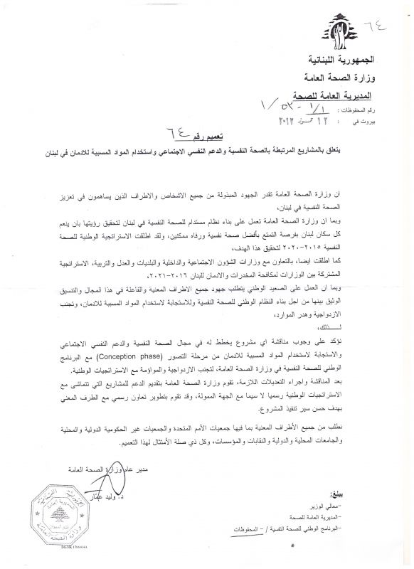 | تعميم | المدير العام | 64 | 12-06-2017 | المشاريع المرتبطة بالصحة النقسية و الدعم النفسي الاجتماعي و استخدام المواد المسببة للادمان في لبنان | تعميم رقم 64: المشاريع المرتبطة بالصحة النقسية و الدعم النفسي الاجتماعي و استخدام المواد المسببة للادمان في لبنان |