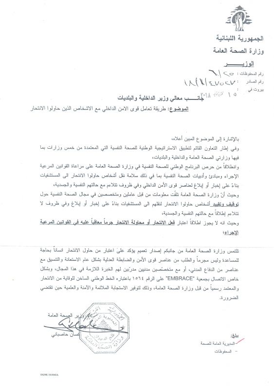 | كتاب | الوزير | 18\1\47527 | 15-11-2018 | كتاب رقم 18\1\47527 من وزارة الصحة العامة الى وزارة الداخلية و البلديات: طريقة تعاطي قوى الأمن الداخلي مع الأشخاص الذين حاولوا الانتحار | كتاب من وزارة الصحة العامة الى وزارة الداخلية و البلديات يتعلق بطريقة تعاطي قوى الأمن الداخلي مع الأشخاص الذين حاولوا الانتحار |