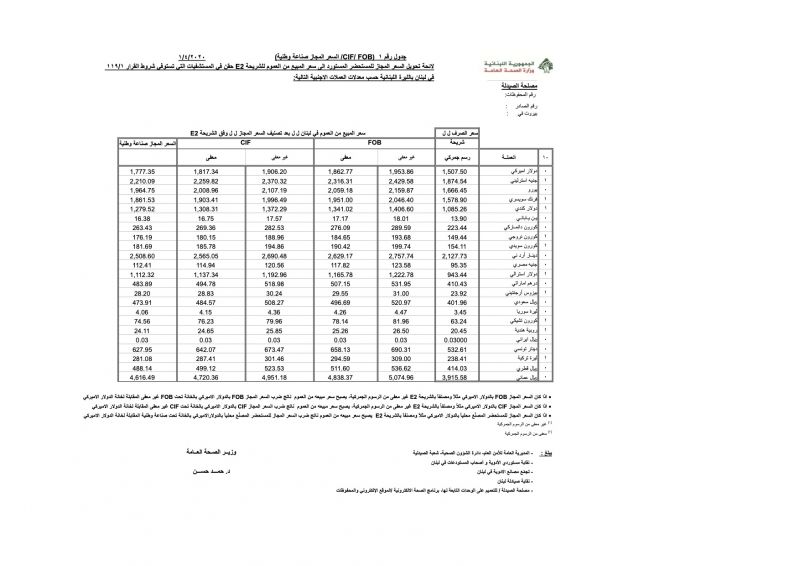لائحة تحويل السعر المجاز (FOB) للمستحضر المستورد إلى سعر المبيع من العموم في لبنان بالليرة اللبنانية حسب معدلات العملات الأجنبية: متوسط أسبوعين من 12/1/2020 إلى 25/1/2020