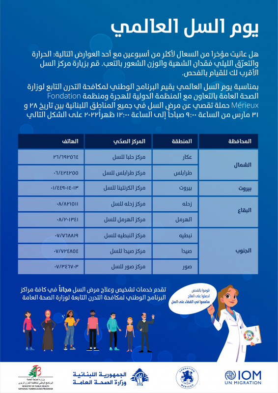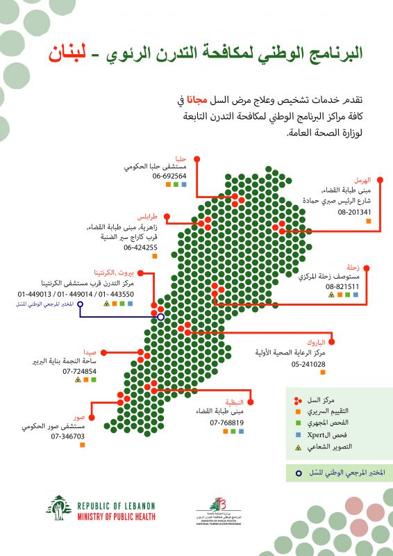 جميع خدمات تشخيص وعلاج مرض السِّل تُقَدَّم مجاناً في كافة مراكز البرنامج الوطني لمكافحة التدرّن التابعة لوزارة الصّحة العامة. للمزيد من المعلومات الرجاء الإتّصال بالمركز الأقرب لكم.
