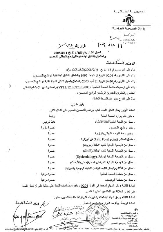 قرار رقم 124 تاريخ 11.2.2009 يتعلق بتشكيل لجنة فنية للبرنامج الوطني للتحصين