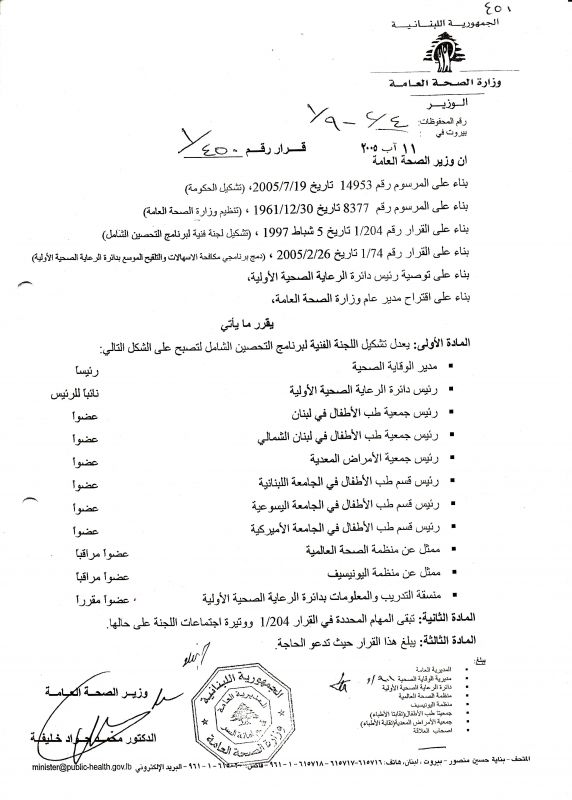 قرار رقم 450 تاريخ 11.8.2005 المتعلق بتشكيل لجنة فنية للبرنامج الوطني للتحصين