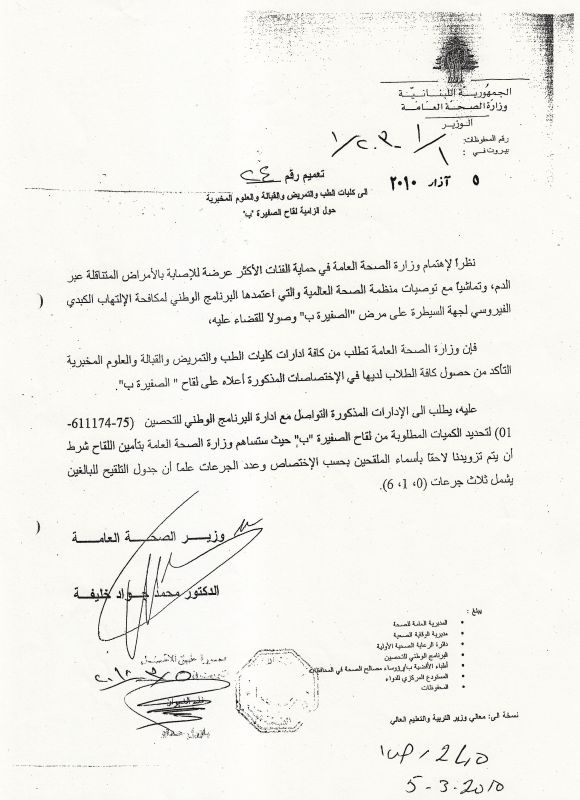 تعميم رقم 24 تاريخ 5.3.2010 موجه الى كليات الطب والتمريض والقبالة والعلوم المخبرية حول الزامية لقاح الصفير ب