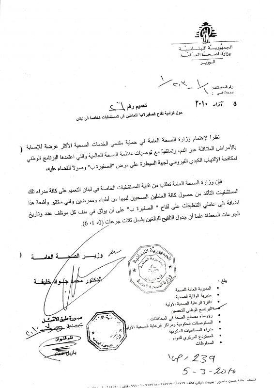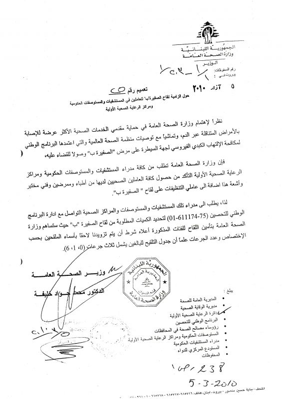 تعميم رقم 25 تاريخ 5.3.2010 حول الزامية الصفيرة ب للعاملين في المستشفيات والمستوصفات