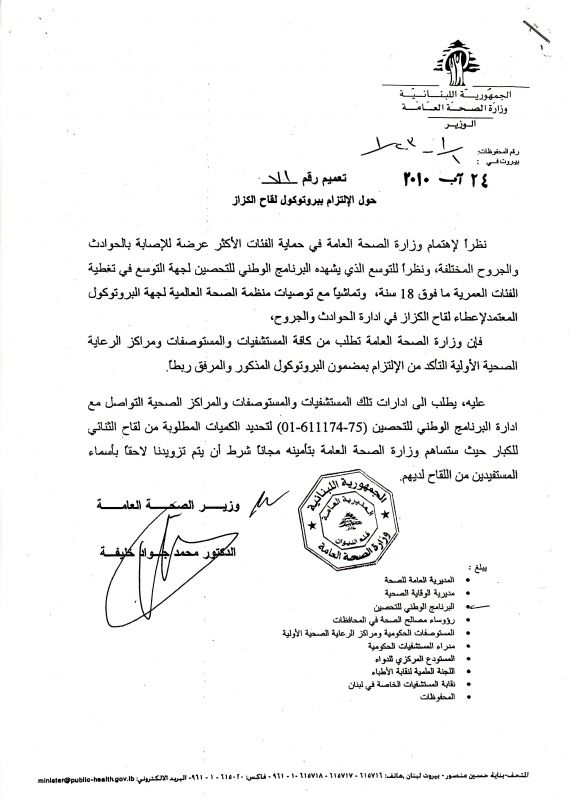 تعميم رقم 71 تاريخ 24.8.2010 حول الإلتزام ببروتوكول لقاح الكزاز