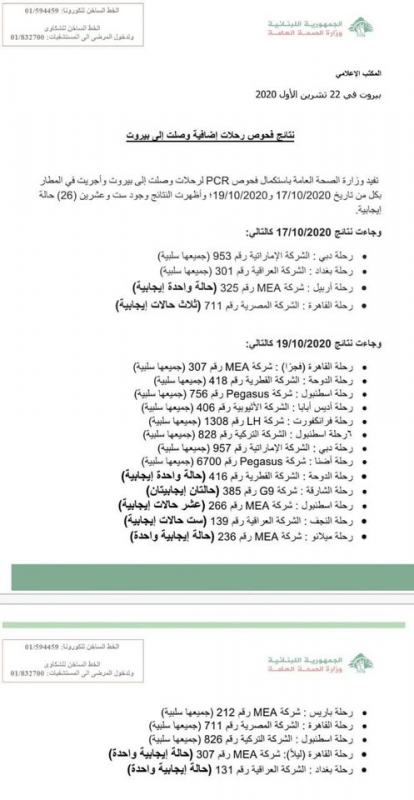 نتائج فحوصات رحلات إضافية وصلت إلى بيروت بتاريخ 17 و19-10-2020