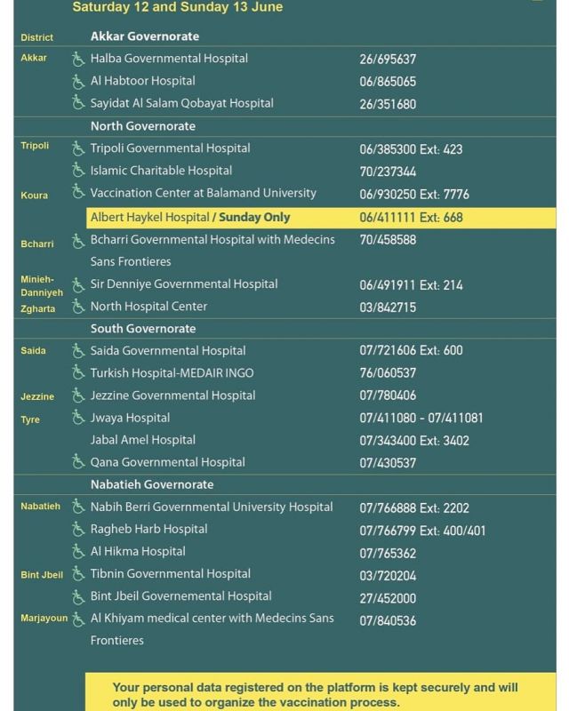 وأوضحت الوزارة أنها "ستعمد الى تقريب المواعيد المحددة في وقت سابق لذوي الحاجات الخاصة ليومي السبت والاحد وستكون مراكز الاقتراع مفتوحة لهم لتسريع تمنيعهم، مع التشديد على أهمية التسجيل المسبق على المنصة لغير المسجلين منهم حتى الآن حرصا على تفادي الازدحام وتمنيع أكبر نسبة معينة من الأشخاص، وتنطبق ضرورة التسجيل المسبق على كامل الفئة المستهدفة المذكورة أعلاه".