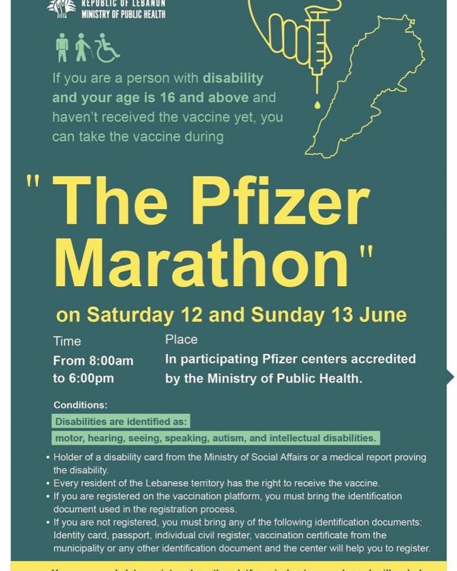 تنظم وزارة الصحة العامة ماراتون فايزر الثالث، "وفق خطة اللجنة التنفيذية للقاح لعمر 55 عاما وما فوق، إضافة إلى ذوي الحاجات الخاصة، وذلك السبت والأحد في 12 و13 حزيران الحالي في كل المحافظات اللبنانية من الثامنة صباحا حتى السادسة مساء".