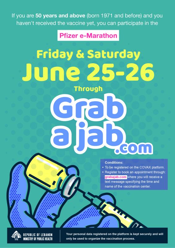 تعلن وزارة الصحة العامة عن تنظيم ماراتون فايزر يومي غد وبعد غد في 25 و26 حزيران لمواليد 1971 وما دون (ممن يبلغون خمسين عاما وما فوق)، في مختلف مراكز التلقيح المعتمدة للقاح فايزر في كل المحافظات اللبنانية.