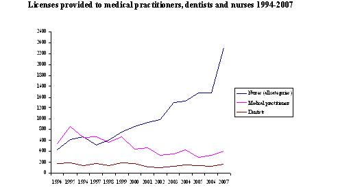 Incapable of playing a meaningful role in reducing oversupply, the MOPH was only able to focus on addressing shortages, particularly that of nurses. MOPH interventions in financing university education programs, in conducting training, in creating and supporting the Nurses’ Order and in improving their financial and work conditions, had a remarkable impact on promoting the nursing profession. The figure below illustrates how in a liberal health system, where government control is ineffective, oversupply can only be partially adjusted by market mechanisms (the slightly declining medical practitioners curve), whereas the regulation authority may intervene and have a significant impact on undersupply by filling specific gaps (the mounting curve of nurses production).