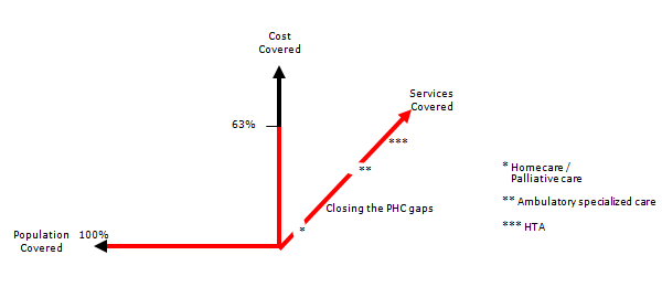 The purpose of Universal Health coverage is to ensure universal accessibility to services that address population health needs and country health priorities with adequate quality, without incurring households financial ruin. This implies reaching a consensus over two major policy decisions: 1st defining a benefit package, and 2nd, setting an acceptable level of financial burden on households, more specifically the OOP bearable level by income category. Starting up from scratch, the benefit package would include essential health services such as PHC, and the government would cover as much health interventions as its budget allows, by beginning with the most cost effective ones such as immunization, TB treatment and prenatal care. Thus the population would expect regular upgrading of the system and would welcome incorporating progressively more advanced services such as renal dialysis, treatment for cancer, and sophisticated surgeries. The dilemma of the health system in Lebanon is the current existence of a universal coverage for tertiary care and sophisticated treatments such as open heart and joint replacement surgeries and expensive cancer patent drugs, whereas, paradoxically, prevention and PHC services are not universally covered.