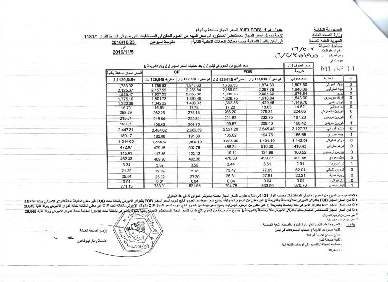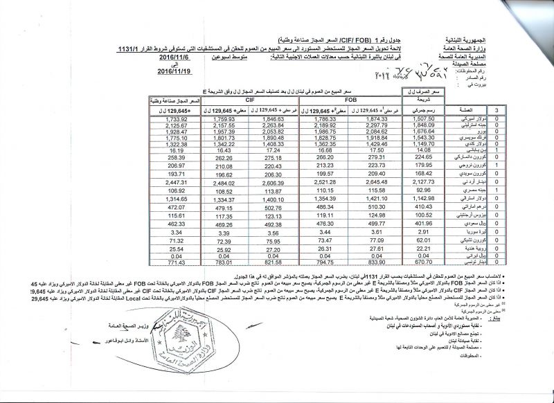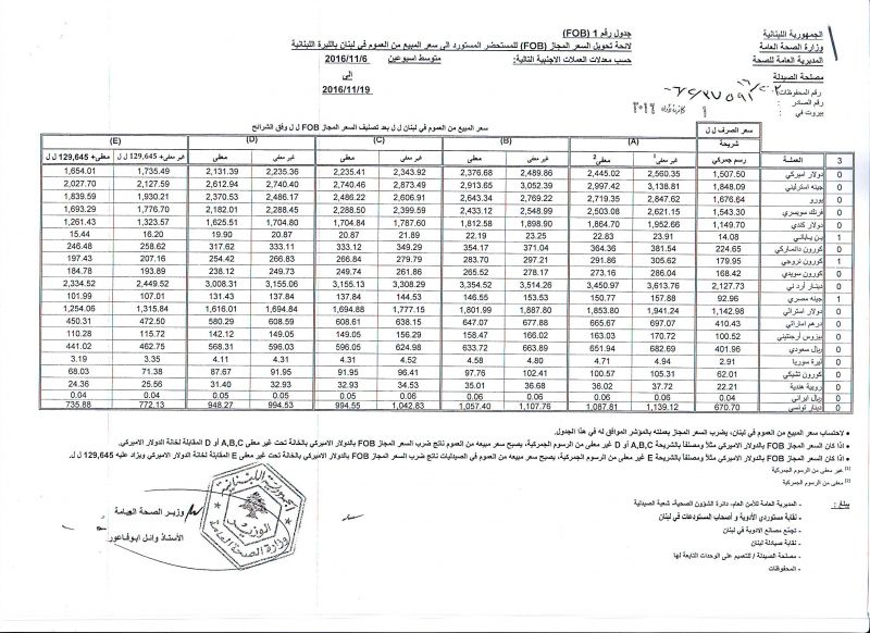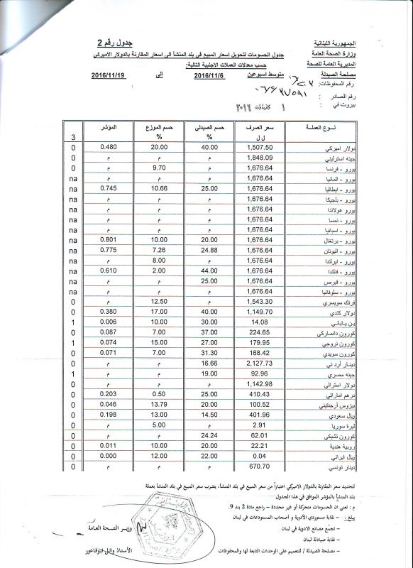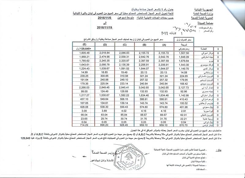 • List of conversion of authorized prices of the imported medicine products to public prices in Lebanon, in Lebanese pound according to the following foreign currency rates: average of the weeks: 6/11/2016 to 19/11/2016  (FOB)