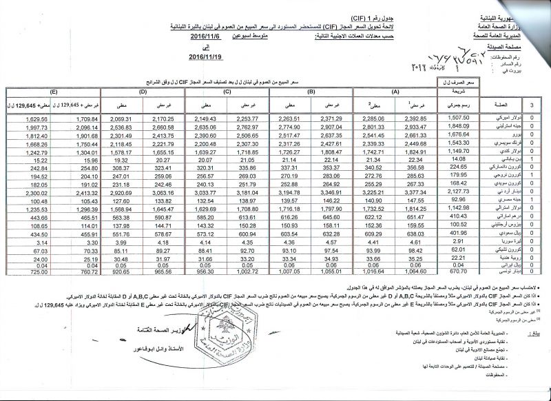 • List of conversion of authorized prices of the imported medicine products to public prices in Lebanon, in Lebanese pound according to the following foreign currency rates: average of the weeks: 6/11/2016 to 19/11/2016  (CIF)