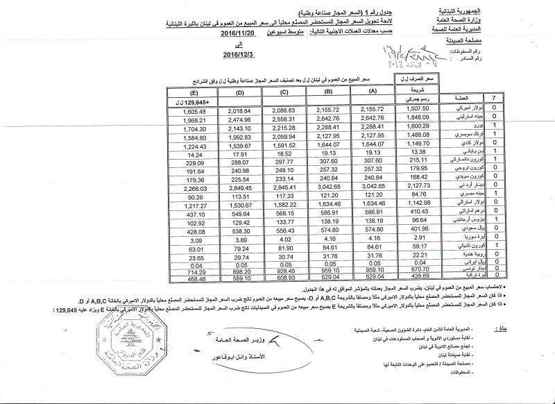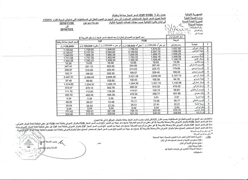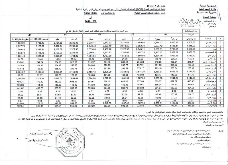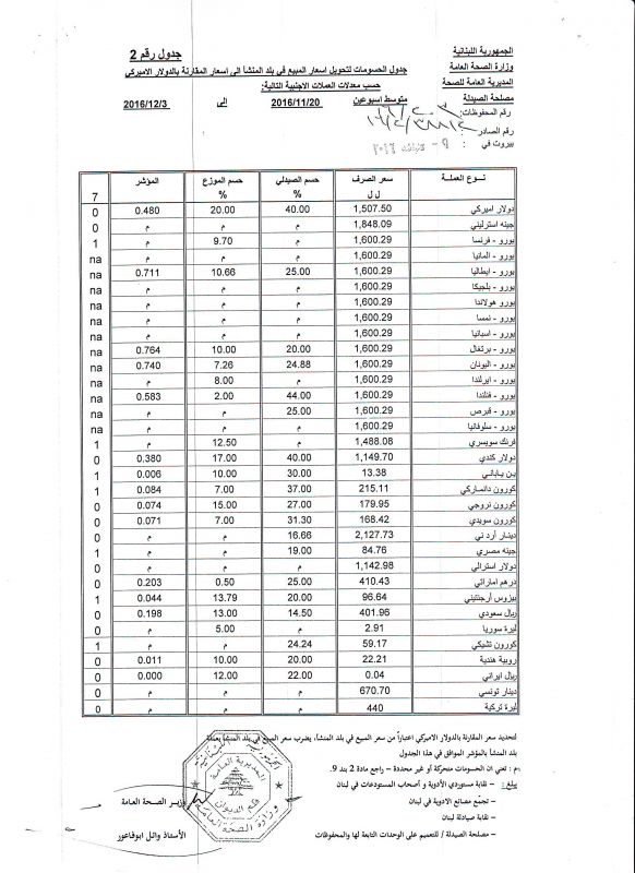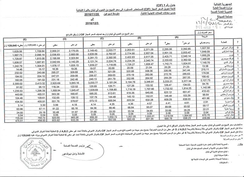 • List of conversion of authorized prices of the imported medicine products to public prices in Lebanon, in Lebanese pound according to the following foreign currency rates: average of the weeks: 20/11/2016 to 3/12/2016  (FOB)