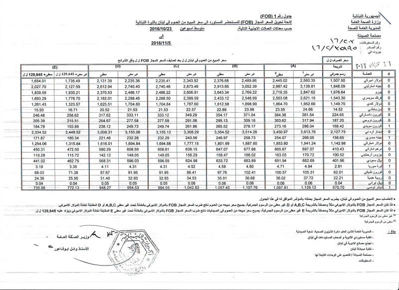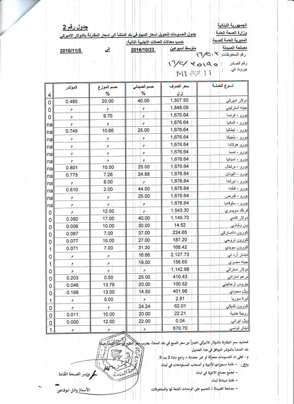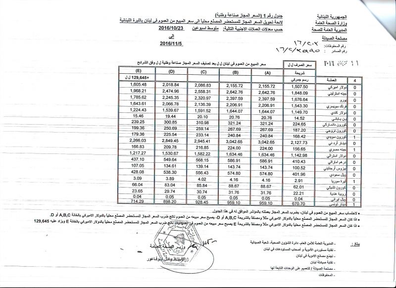 • List of conversion of authorized prices of the imported medicine products to public prices in Lebanon, in Lebanese pound according to the following foreign currency rates: average of the weeks: 23/10/2016 to 5/11/2016  (FOB)