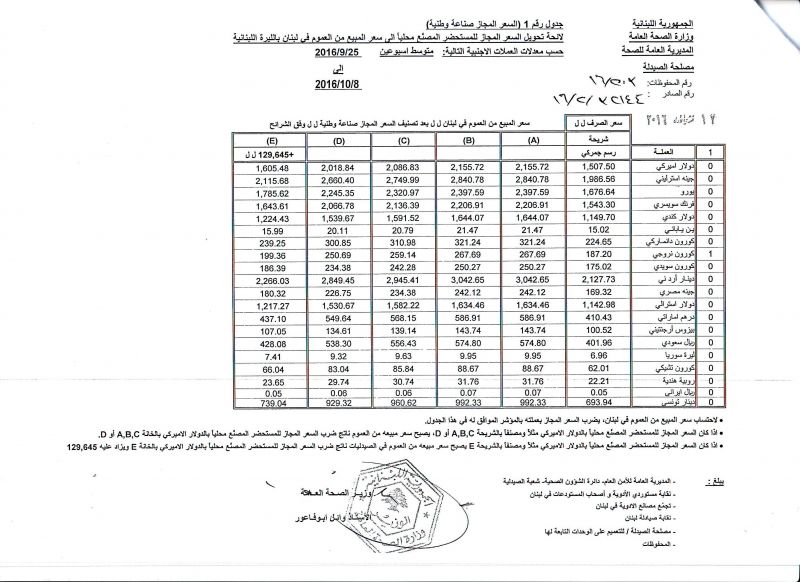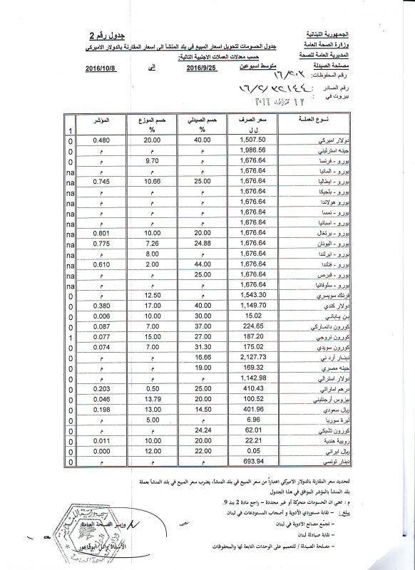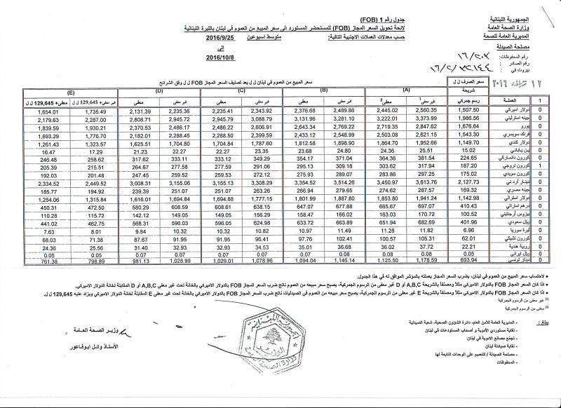 • List of conversion of authorized prices of the imported medicine products to public prices in Lebanon, in Lebanese pound according to the following foreign currency rates: average of the weeks: 25/9/2016 to 8/10/2016  (FOB)