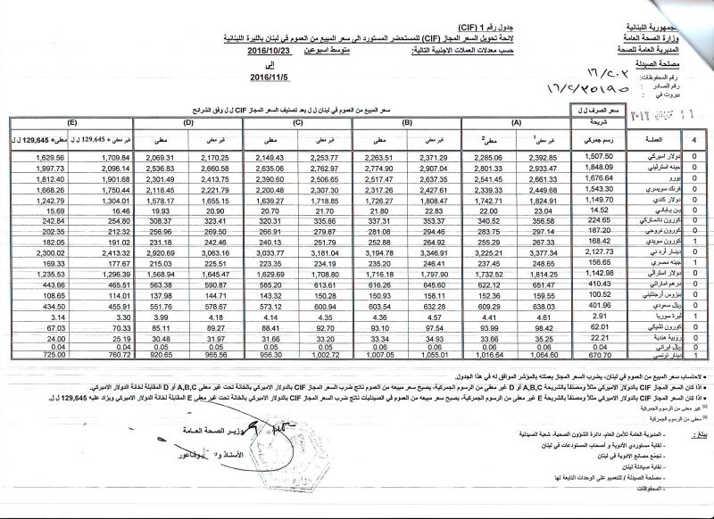 • List of conversion of authorized prices of the imported medicine products to public prices in Lebanon, in Lebanese pound according to the following foreign currency rates: average of the weeks: 23/10/2016 to 5/11/2016  (CIF)