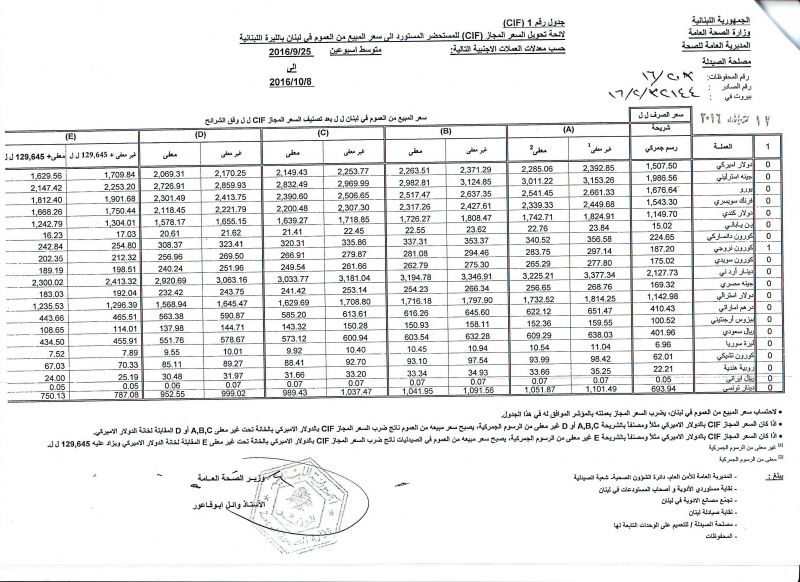 • List of conversion of authorized prices of the imported medicine products to public prices in Lebanon, in Lebanese pound according to the following foreign currency rates: average of the weeks: 25/9/2016 to 8/10/2016  (CIF)