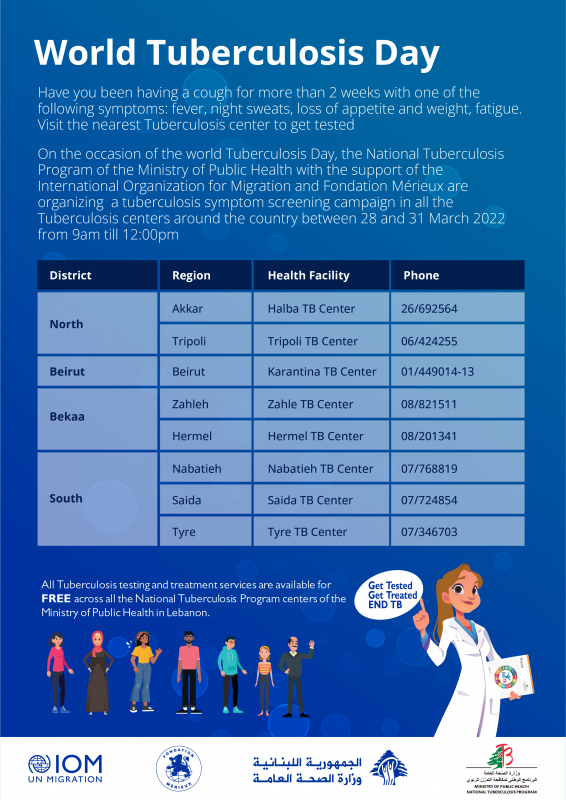 All Tuberculosis testing and treatment services are available for FREE across all the National Tuberculosis Programme centers of the Ministry of Public Health in Lebanon. For more information, please contact the center nearest to you.